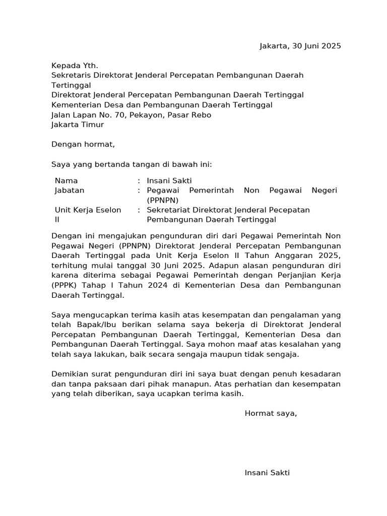 Dengan ini mengajukan pengunduran diri dari Pegawai Pemerintah Non