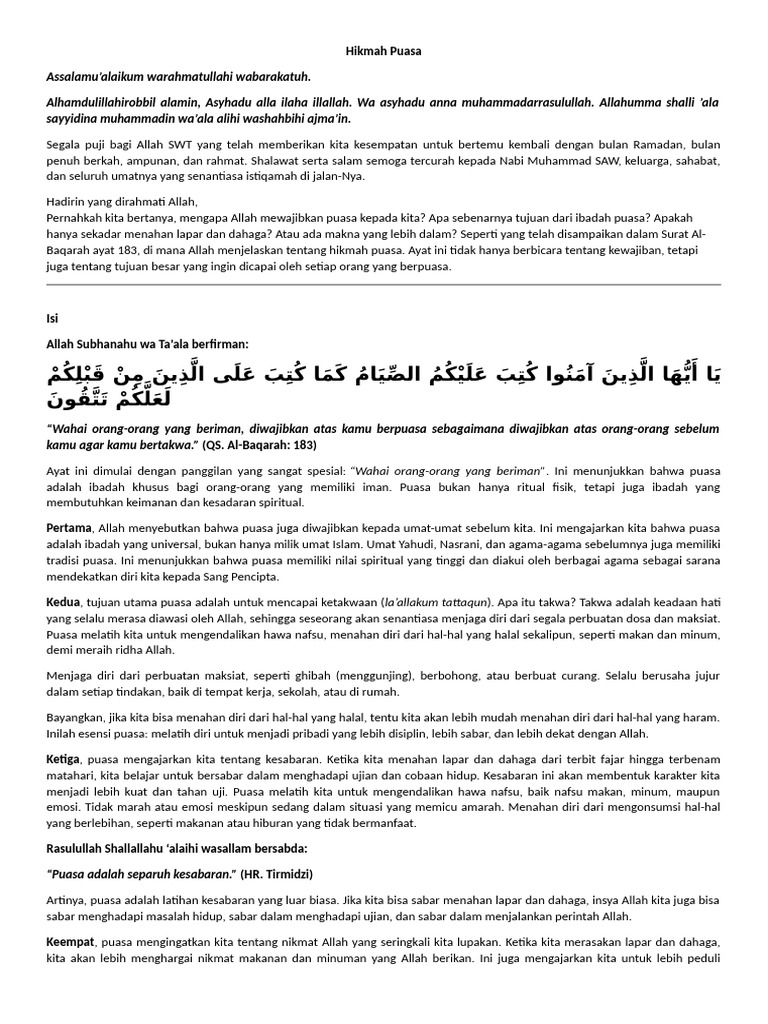 Mari kita renungkan kembali hikmah-hikmah puasa yang telah Allah jelaskan dalam Surat Al-Baqarah ayat 183. Puasa bukan
