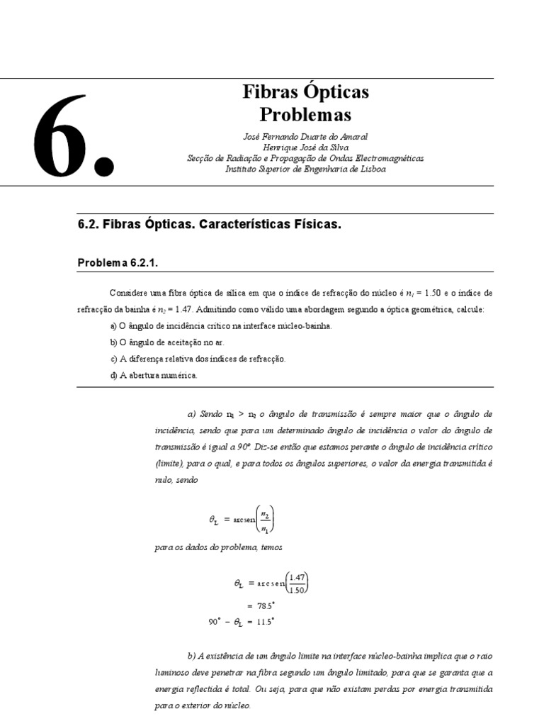 Considere uma fibra ptica de slica em que o ndice de refraco do ncleo n1 = 1.50 e o ndice de refraco da bainha n2 = 1.47. Admitindo como vlido uma abordagem segundo a ptica geomtrica, calcule: a) O ngulo de incidncia crtico na interface ncleo-bainha. b) O ngulo de aceitao no ar. c) A diferena relativa dos ndices de refraco. d) A abertura numrica.