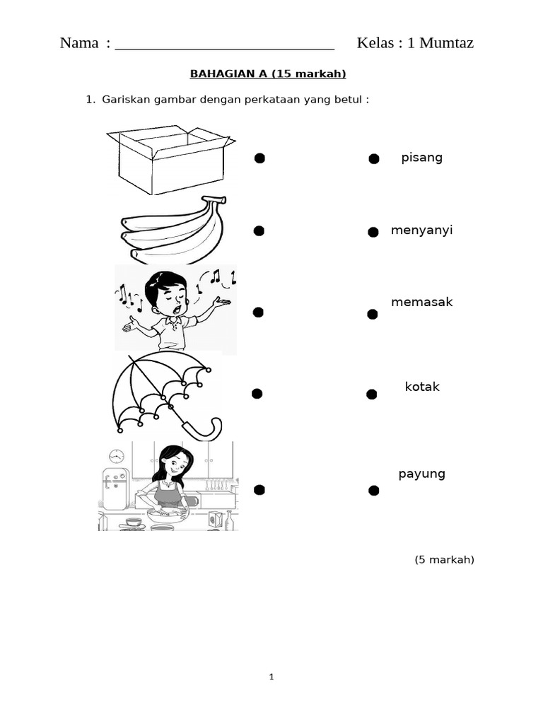 1. Gariskan gambar dengan perkataan yang betul :