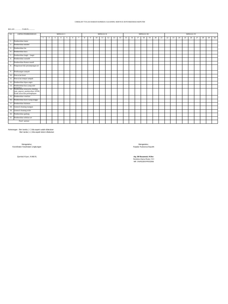 CHEKLIST TUGAS HARIAN KINERJA CLEANING SERVICE DI PUSKESMAS KEPUTIH