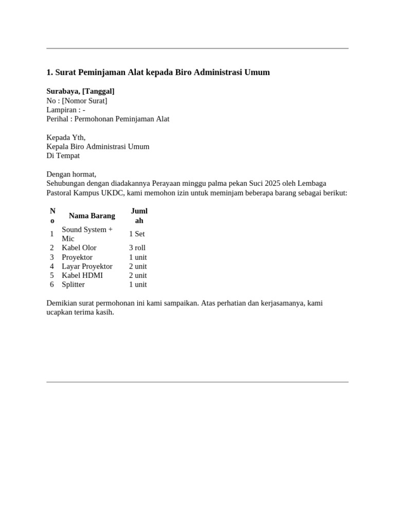 Surat Peminjaman Alat kepada Biro Administrasi Umum