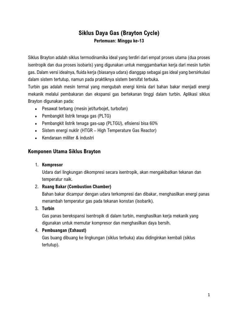 mekanik melalui pembakaran dan ekspansi gas bertekanan tinggi dalam turbin. Aplikasi siklus