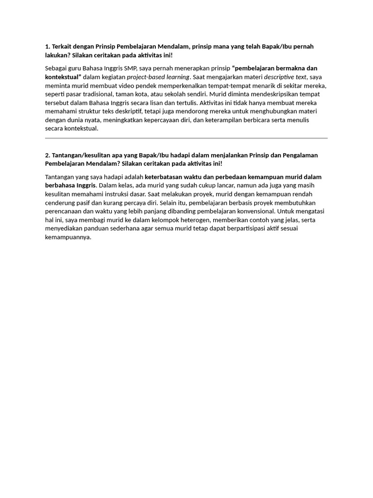Terkait dengan Prinsip Pembelajaran Mendalam, prinsip mana yang telah Bapak/Ibu pernah