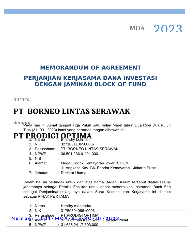 No : 001/MOA/BLS-PO/III/2023 PERJANJIAN KERJASAMA DANA [MOA
