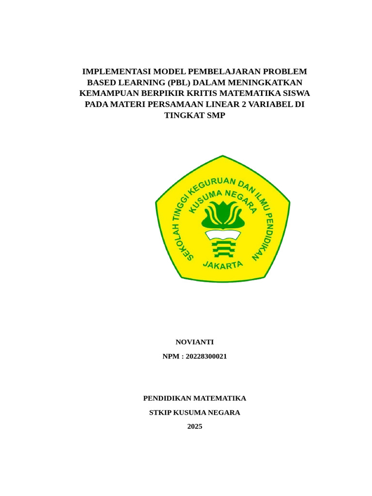 Mulyani, L. (2020). Penerapan Model PBL untuk Meningkatkan Kemampuan Berpikir Kritis dan