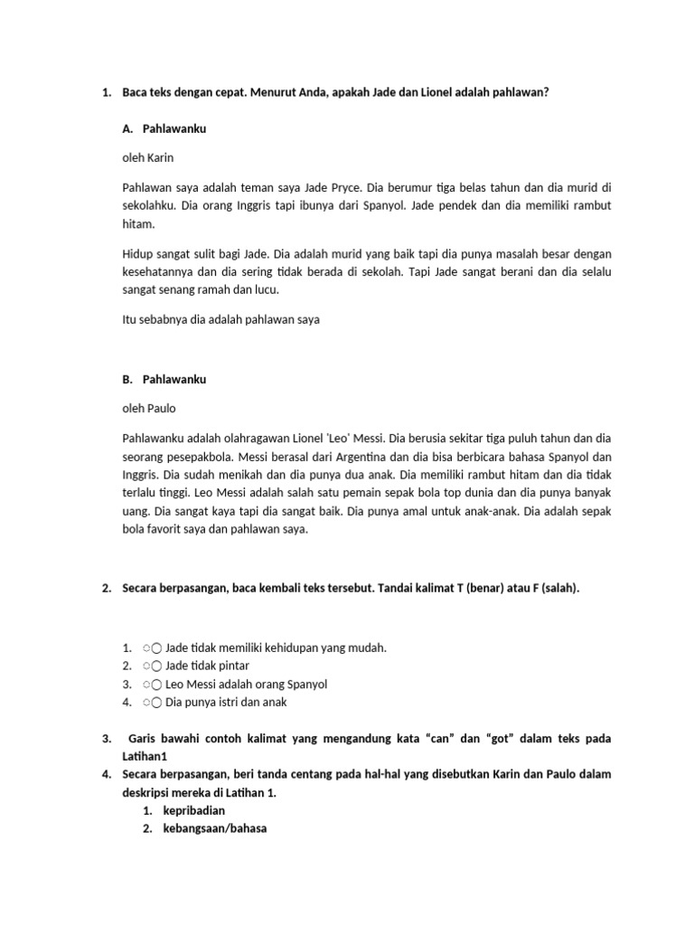 1. Baca teks dengan cepat. Menurut Anda, apakah Jade dan Lionel adalah pahlawan?