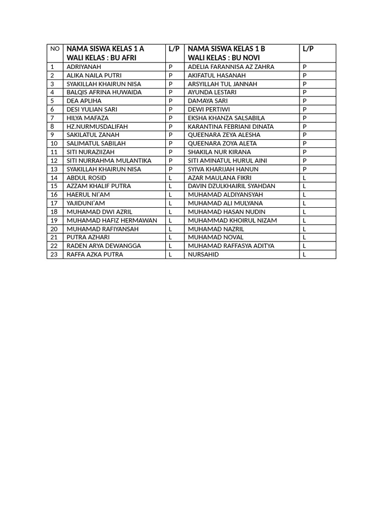 NO NAMA SISWA KELAS 1 A L/P NAMA SISWA KELAS 1 B L/P