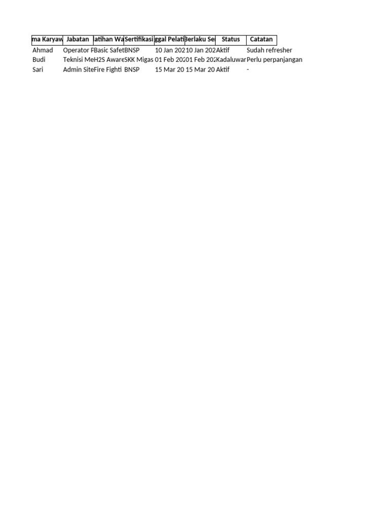 Budi Teknisi MeH2S AwareSKK Migas 01 Feb 20201 Feb 202KadaluwarPerlu perpanjangan