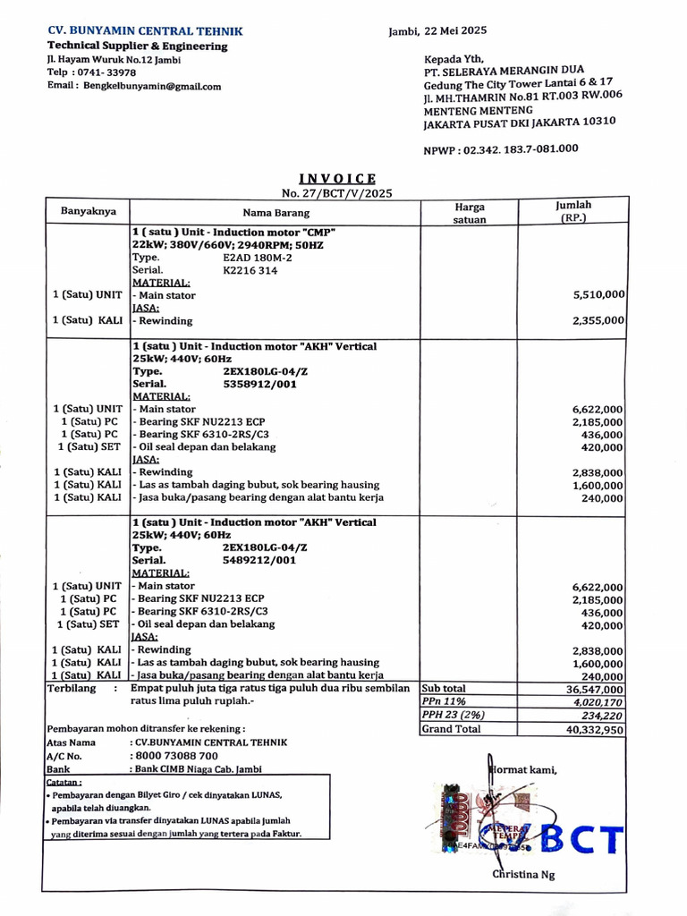 Pembayaran mohon ditransfer ke rekening : Grand Total 40,332,950