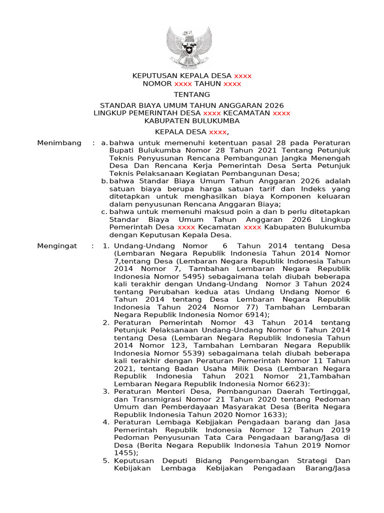 Menetapkan : KEPUTUSAN KEPALA DESA xxxx TENTANG STANDAR BIAYA UMUM