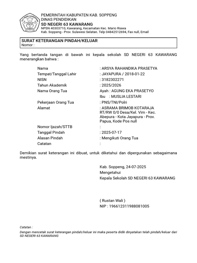 Dengan mencetak surat keterangan pindah/keluar ini maka peserta didik dinyatakan telah pindah/keluar dari
