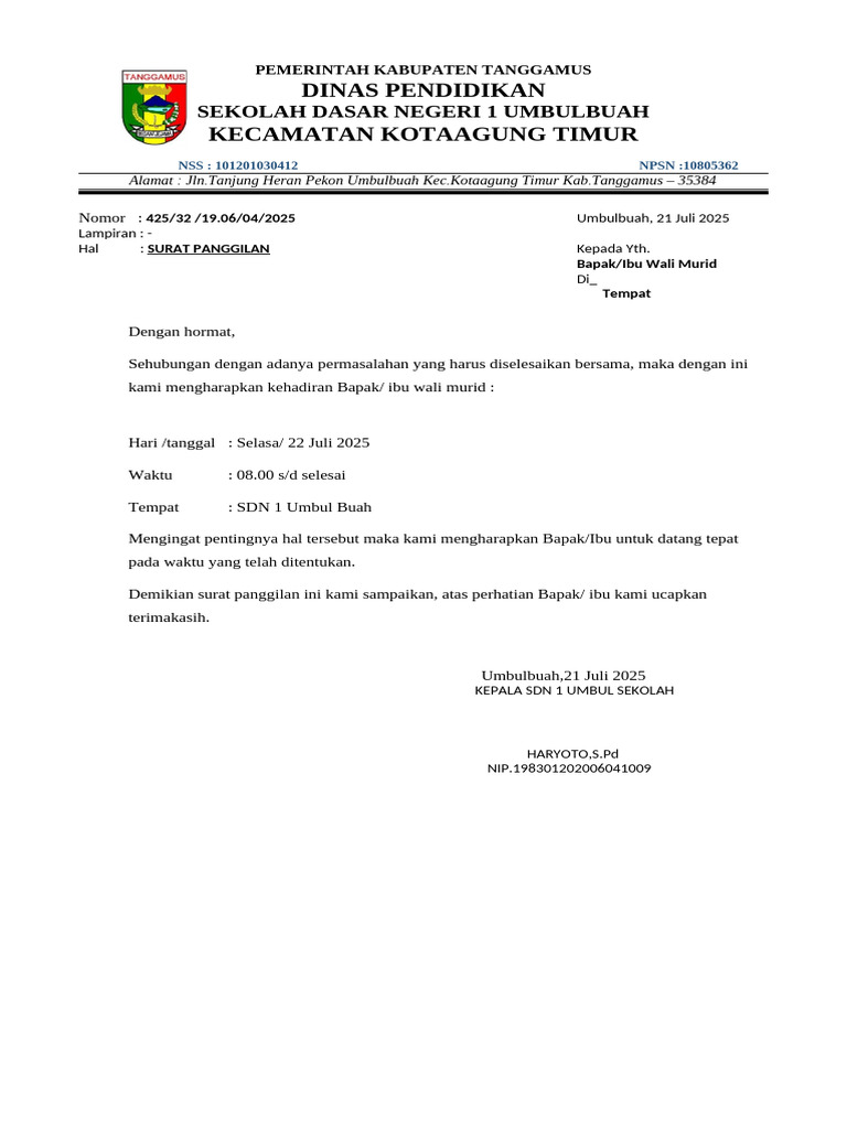 Nomor : 425/32 /19.06/04/2025 Umbulbuah, 21 Juli 2025