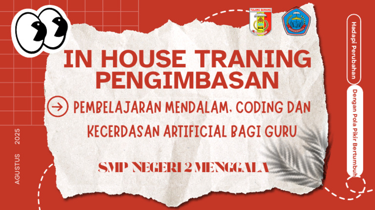 Dokumen ini adalah tentang pelatihan in-house yang berfokus pada pengembangan pola pikir bertumbuh, pembelajaran mendalam, coding, dan kecerdasan buatan untuk guru. Pelatihan ini direncanakan berlangsung di SMP Negeri 2 Menggala pada Agustus 2025. Tujuan dari pelatihan ini adalah untuk menghadapi perubahan dalam pendidikan.