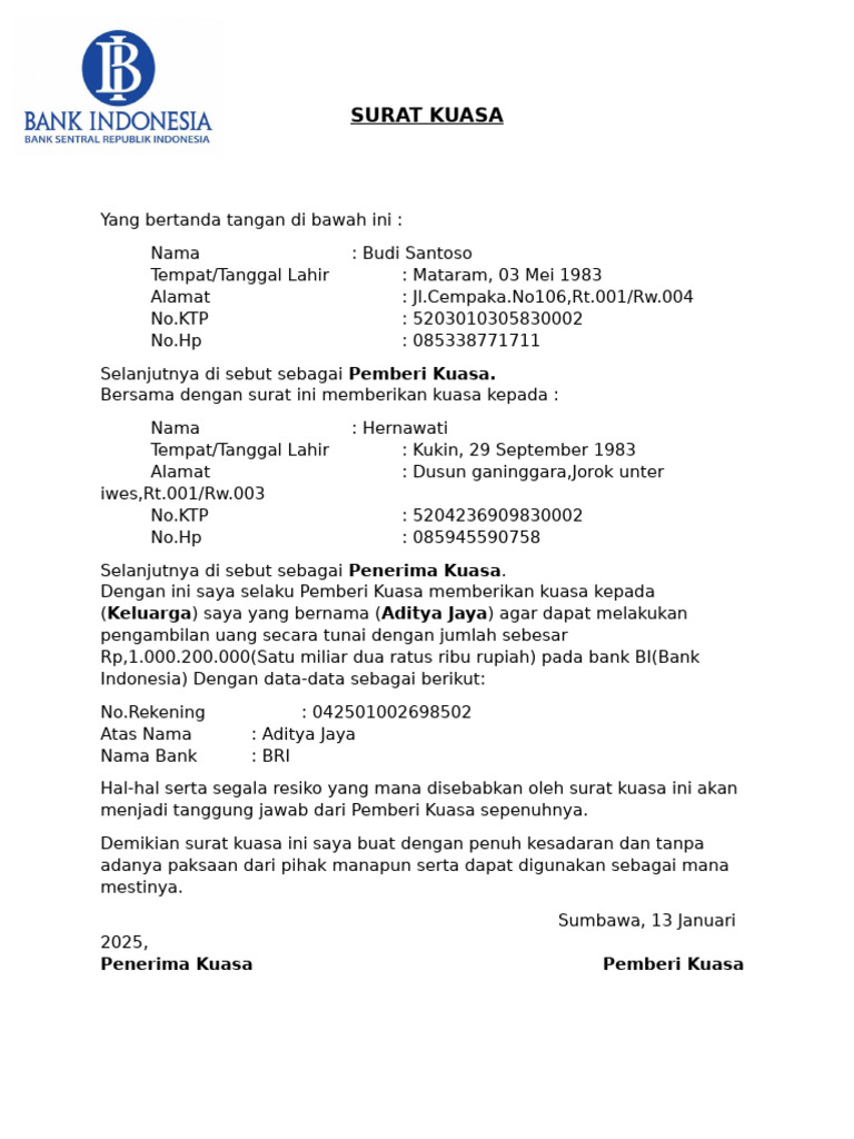 Demikian surat kuasa ini saya buat dengan penuh kesadaran dan tanpa