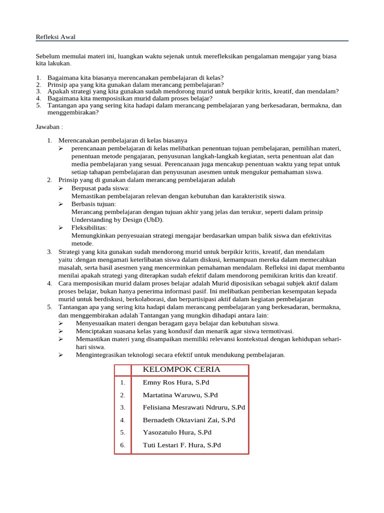 masalah, serta hasil asesmen yang mencerminkan pemahaman mendalam. Refleksi ini dapat membantu
