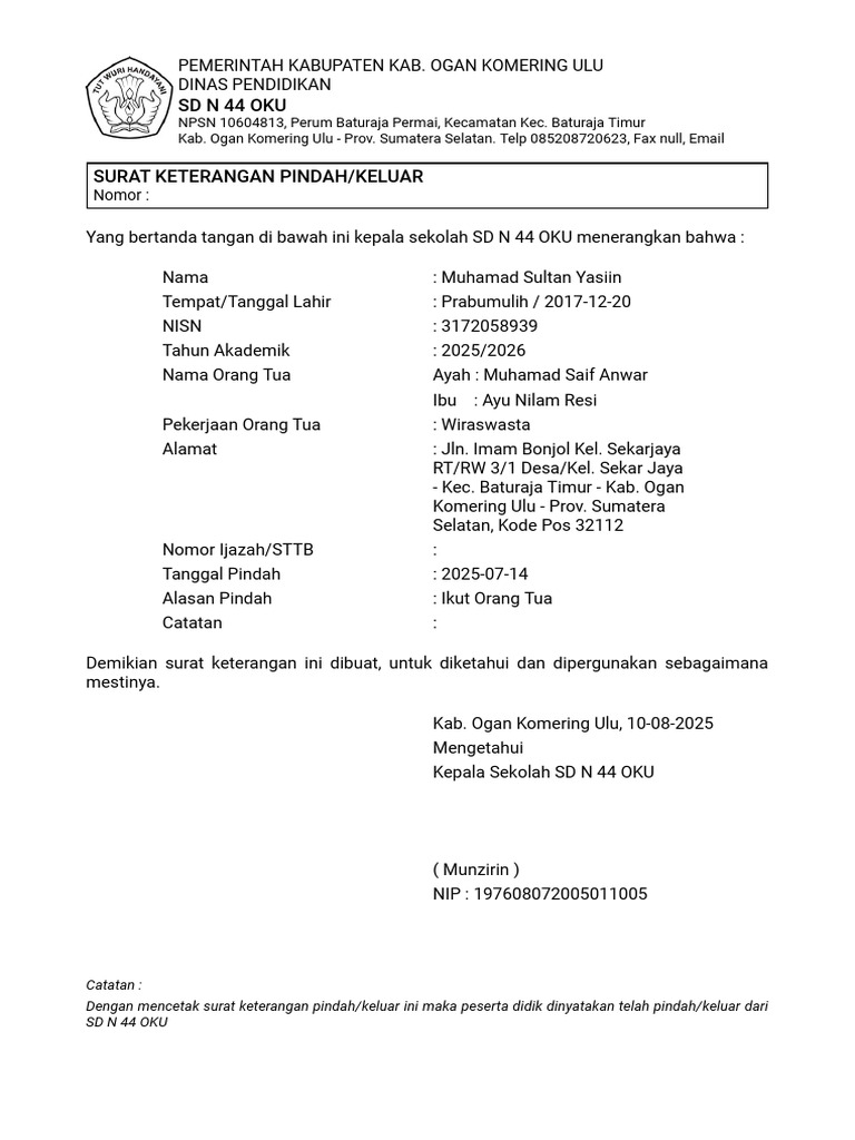 Dengan mencetak surat keterangan pindah/keluar ini maka peserta didik dinyatakan telah pindah/keluar dari