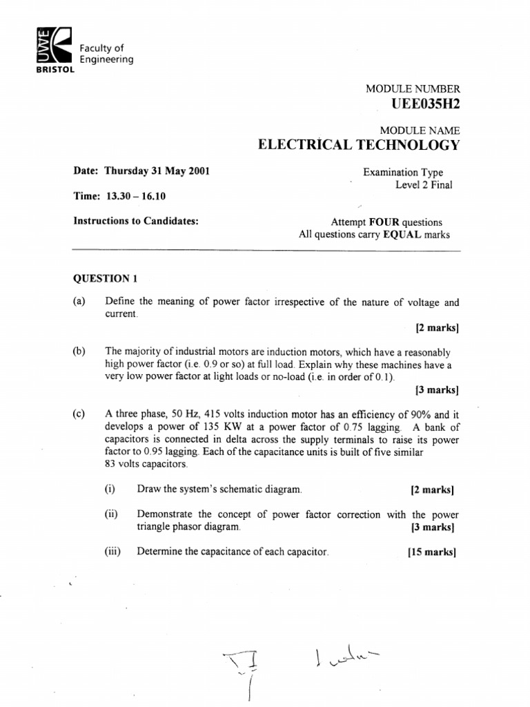 QUESTTON I (a) Define the meaning of power factor irrespectiveof the nature of voltage and current' [2 marks] The majorityof industrialmotorsareinductionmotors,which havea reasonably high power factor (i.e 0.9 or so) at full load.Explainwhy thesemachines havea very low power factorat light loadsor no-load(i.e. in orderof 0.1). [3 marks] A three phase,50 Hz, 415 volts induction motor has an efliciency of 90Yoand it developsa power of 135 KW at a power factor of 0.75 lagging A bank of capacitorsis connectedin delta acrossthe supply terminals to raise its power factorto 0.95 lagging.Eachof the capacitance units is built of five similar 83 volts capacitors. (i) (ii) Draw the system'sschematic diagram 12marlcl