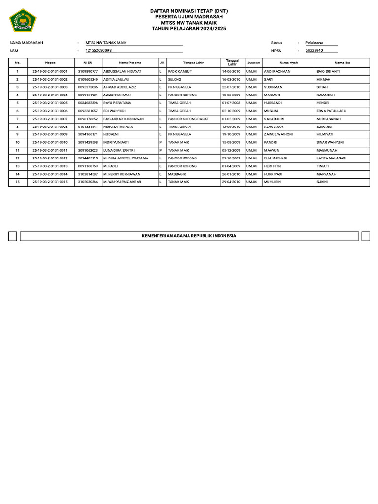 No. Nopes NISN Nama Peserta JK Tempat Lahir Tanggal Lahir Jurusan Nama Ayah Nama Ibu