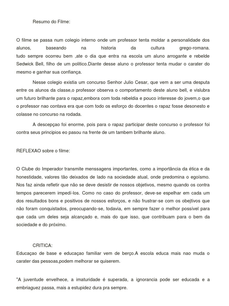 caracterizam?________________________________________________________________ ___________________________________________________________________________ ___________________________________________________________________________ ___________________________________________________________________________ ___________________________________________________________________________ ___________________________________________________________________________ ___________________________________________________________________________ ___________________________________________________________________________ ___________________________________________________________________________ _____________________________________________________________________ (3) ser possvel aos professores atravs de suas atitudes modificar o futuro de seus alunos? ___________________________________________________________________________ ___________________________________________________________________________ ___________________________________________________________________________ ___________________________________________________________________________ ___________________________________________________________________________ (4) qual o significado de educar, passado no filme pelo professor hundert? No filme o conceito de educar vai muito alm do ato de transmitir conhecimento, educar estimular o raciocnio, aprimorar o senso crtico, as faculdades intelectuais, fsicas e morais. O homem um ser que precisa de orientao e informao. Esses conhecimentos so adquiridos na escola, e ela, juntamente com os pais, deve despertar nos alunos a curiosidade e a capacidade para entender o mundo que os cerca, e de ensin-los os conceitos empregados pela sociedade. (5) ate que ponto a convivncia diria com os professores pode influenciar o carter e as atitudes dos alunos?