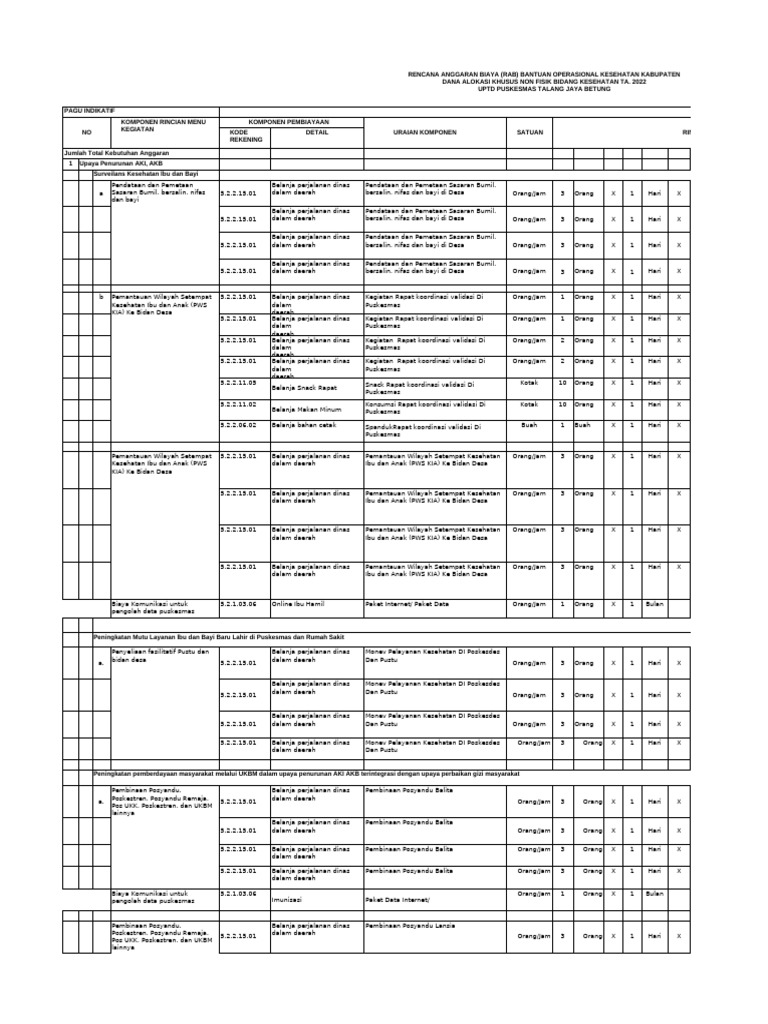 NO KOMPONEN RINCIAN MENU KEGIATAN KOMPONEN PEMBIAYAAN URAIAN KOMPONEN SATUAN RINCIAN