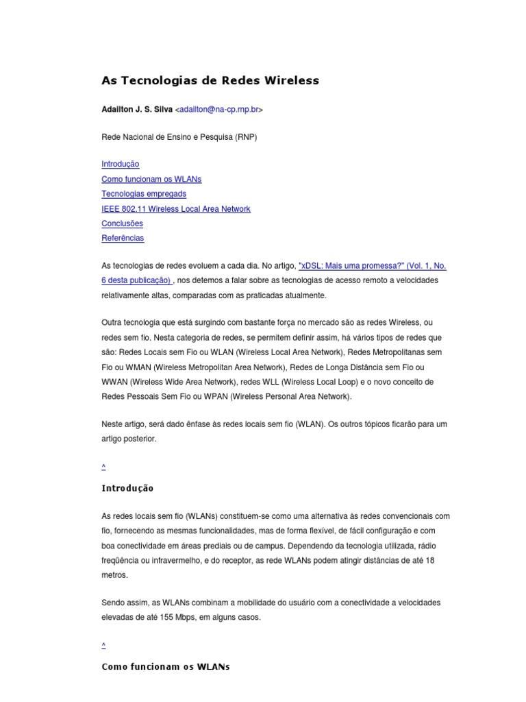 Neste artigo, ser dado nfase s redes locais sem fio (WLAN). Os outros tpicos ficaro para um artigo posterior.