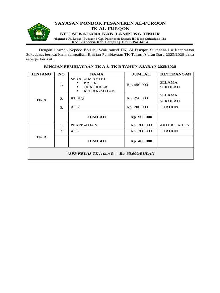 Sukadana, berikut kami sampaikan Rincian Pembiayaan TK Tahun Ajaran Baru 2025/2026 yaitu
