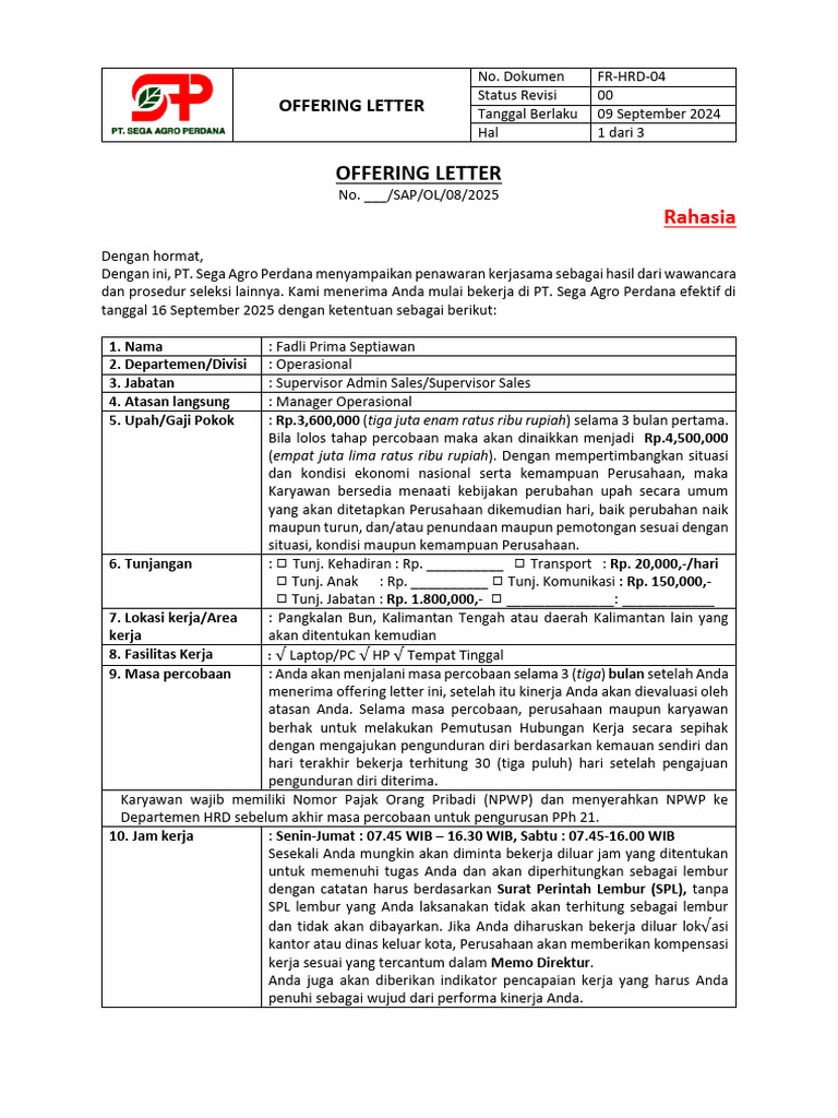 menerima offering letter ini, setelah itu kinerja Anda akan dievaluasi oleh