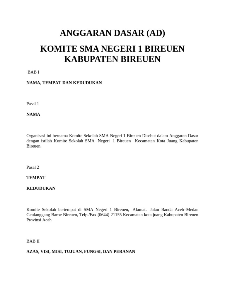 Organisasi ini bernama Komite Sekolah SMA Negeri 1 Bireuen Disebut dalam Anggaran Dasar
