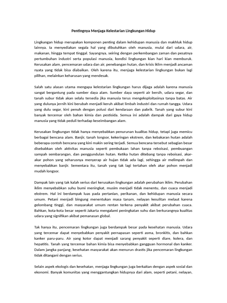 Menjaga kelestarian lingkungan hidup adalah tanggung jawab kita bersama. Setiap tindakan kecil