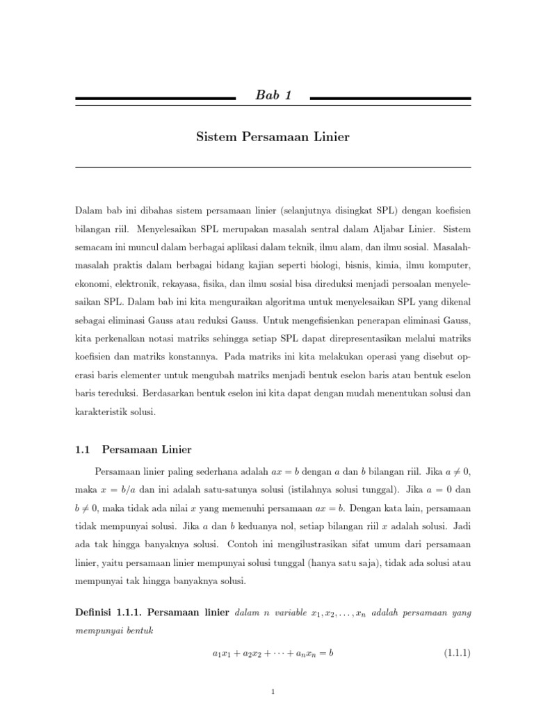 Dalam bab ini dibahas sistem persamaan linier (selanjutnya disingkat SPL) dengan koefisien