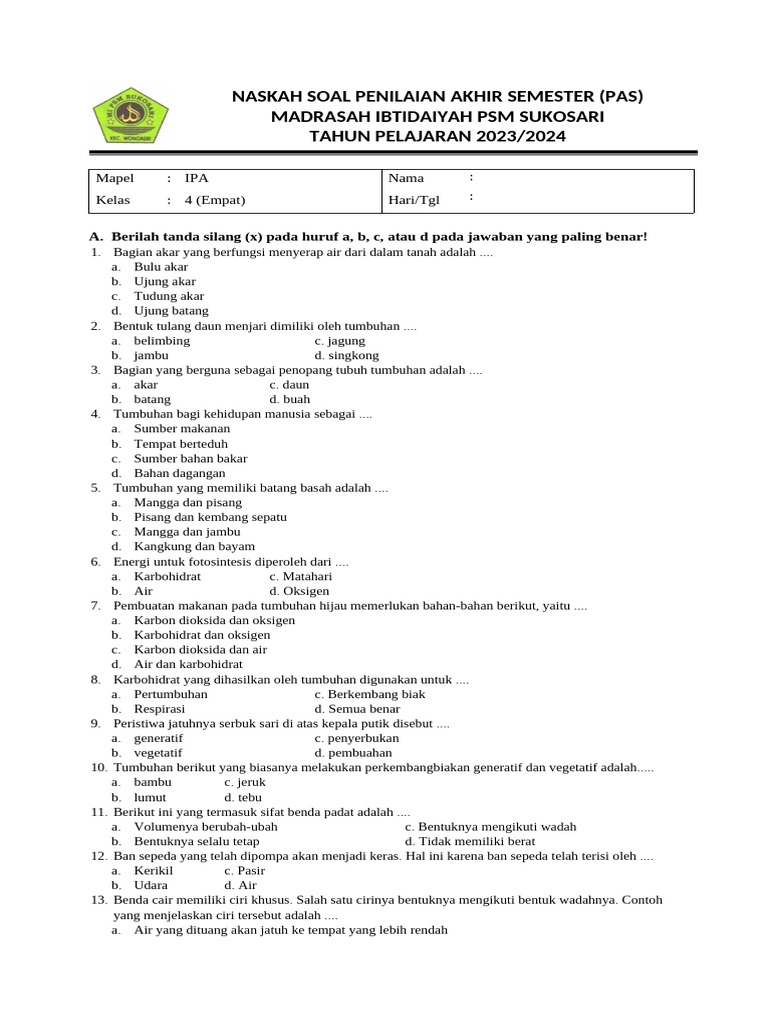 A. Berilah tanda silang (x) pada huruf a, b, c, atau d pada jawaban yang paling benar!