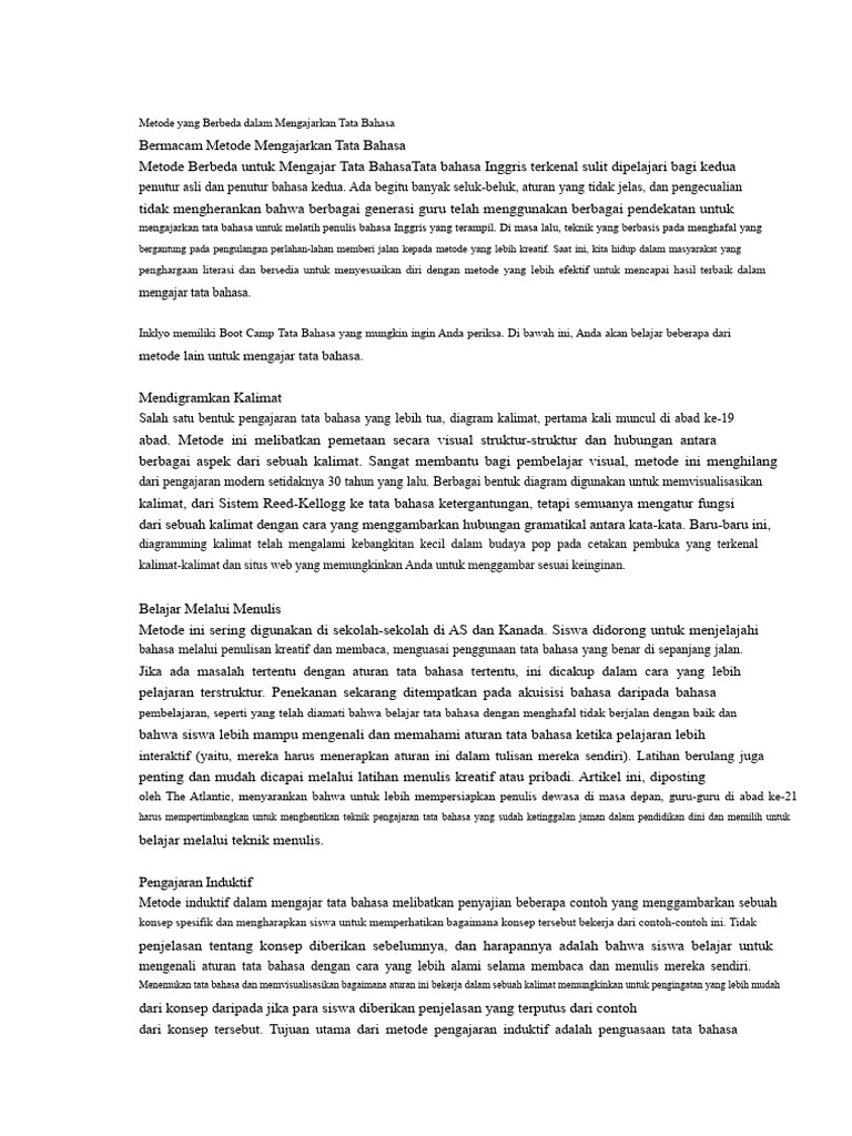 Metode induktif dalam mengajar tata bahasa melibatkan penyajian beberapa contoh yang menggambarkan sebuah