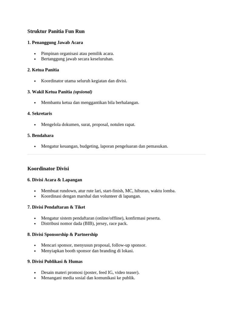 Membuat rundown, atur rute lari, start-finish, MC, hiburan, waktu lomba.