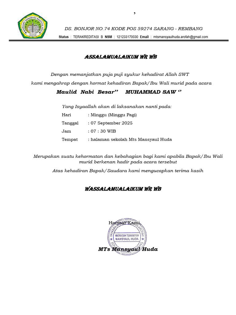 Status : TERAKREDITASI B NSM : 121233170030 Email : mtsmansyaulhuda.arofah@gmail.com