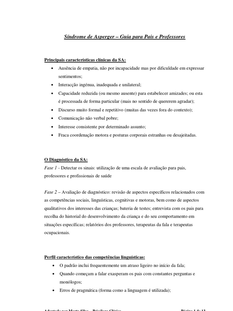 =» Manter os apoios educativos Muitas das competências de que carecem as crianças com SA não são ensinadas como componentes específicos do currículo escolar, sendo essencial que mantenha os apoios educativos, a fim de lhe proporcionar um ensino individual ou em pequenos grupos e melhorar o seu comportamento social. Neste apoio o número de horas deve ser estabelecido caso a caso, tendo sempre em conta as necessidades específicas de cada criança.