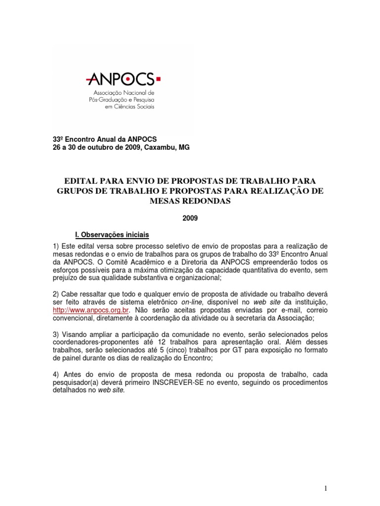 2009 I. Observaes iniciais 1) Este edital versa sobre processo seletivo de envio de propostas para a realizao de mesas redondas e o envio de trabalhos para os grupos de trabalho do 33 Encontro Anual da ANPOCS. O Comit Acadmico e a Diretoria da ANPOCS empreendero todos os esforos possveis para a mxima otimizao da capacidade quantitativa do evento, sem prejuzo de sua qualidade substantiva e organizacional; 2) Cabe ressaltar que todo e qualquer envio de proposta de atividade ou trabalho dever ser feito atravs de sistema eletrnico on-line, disponvel no web site da instituio, http://www.anpocs.org.br. No sero aceitas propostas enviadas por e-mail, correio convencional, diretamente coordenao da atividade ou secretaria da Associao; 3) Visando ampliar a participao da comunidade no evento, sero selecionados pelos coordenadores-proponentes at 12 trabalhos para apresentao oral. Alm desses trabalhos, sero selecionados at 5 (cinco) trabalhos por GT para exposio no formato de painel durante os dias de realizao do Encontro; 4) Antes do envio de proposta de mesa redonda ou proposta de trabalho, cada pesquisador(a) dever primeiro INSCREVER-SE no evento, seguindo os procedimentos detalhados no web site.