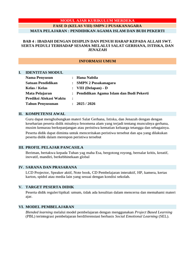 Mata Pelajaran : Pendidikan Agama Islam dan Budi Pekerti