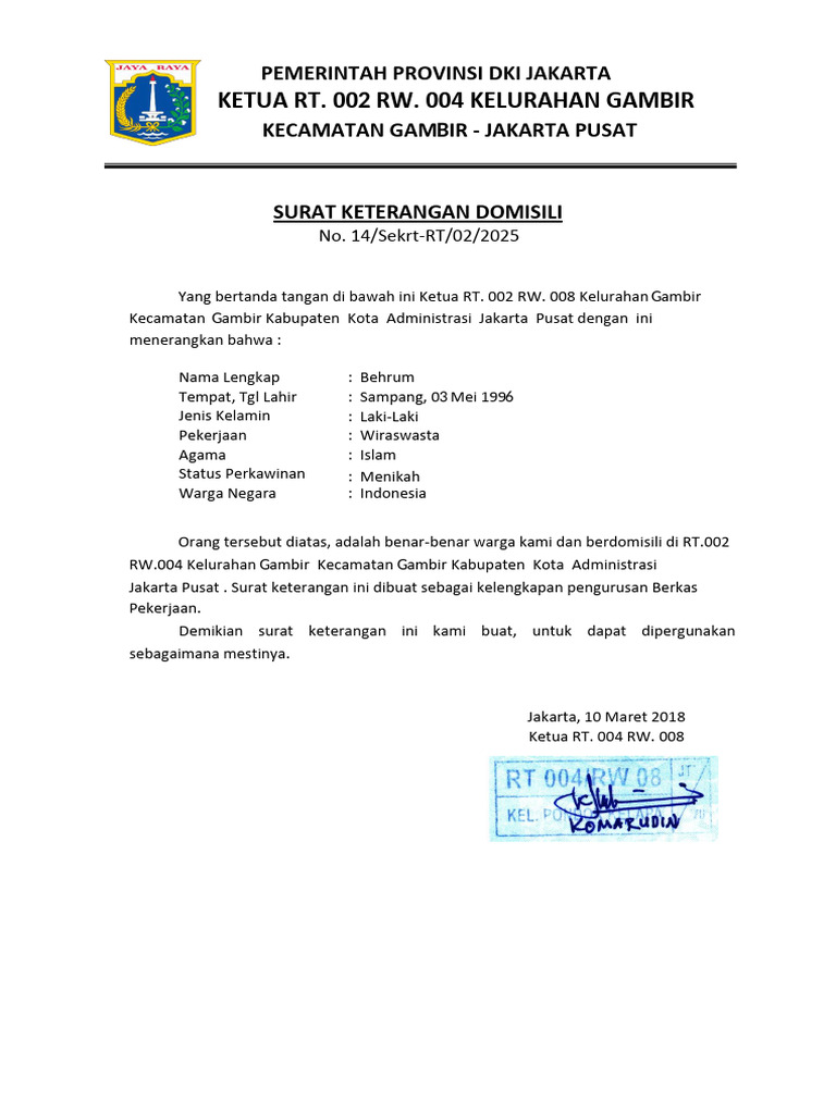 Yang bertanda tangan di bawah ini Ketua RT. 002 RW. 008 Kelurahan Gambir