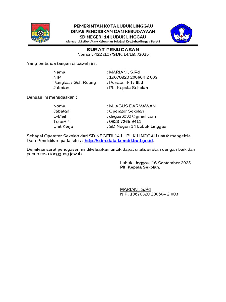 Sebagai Operator Sekolah dari SD NEGERI 14 LUBUK LINGGAU untuk mengelola