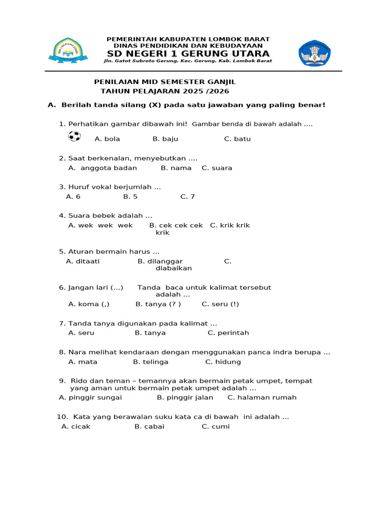 A. Berilah tanda silang (X) pada satu jawaban yang paling benar!