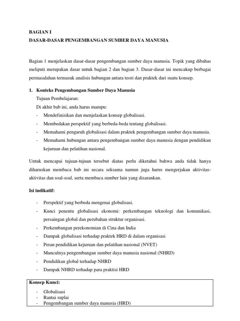 Bagian 1 menjelaskan dasar-dasar pengembangan sumber daya manusia. Topik yang dibahas meliputi merupakan dasar untuk bagian 2 dan bagian 3. Dasar-dasar ini mencakup berbagai permasalahan termasuk analisis hubungan antara teori dan praktek dari suatu konsep. 1. Konteks Pengembangan Sumber Daya Manusia Tujuan Pembelajaran: Di akhir bab ini, anda harus mampu: Mendefinisikan dan menjelaskan konsep globalisasi. Membedakan perspektif yang berbeda-beda tentang globalisasi. Memahami pengaruh globalisasi dalam praktek pengembangan sumber daya manusia. Memahami hubungan antara pengembangan sumber daya manusia dengan pendidikan kejuruan dan pelatihan nasional. Untuk mencapai tujuan-tujuan tersebut diatas perlu diketahui bahwa anda tidak hanya diharuskan membaca bab ini secara seksama namun juga harus mengerjakan aktivitasaktivitas dan soal-soal, serta membaca sumber lain yang disarankan. Isi indikatif: Perspektif yang berbeda mengenai globalisasi. Kunci penentu globalisasi ekonomi: perkembangan teknologi dan komunikasi, persaingan global dan perubahan struktur organisasi. Perkembangan perekonomian di Cina dan India Dampak globalisasi terhadap praktek HRD di dalam organisasi Peran pendidikan kejuruan dan pelatihan nasional (NVET) Munculnya pengembangan sumber daya manusia nasional (NHRD) Pendidikan global terhadap NHRD Dampak NHRD terhadap para praktisi HRD