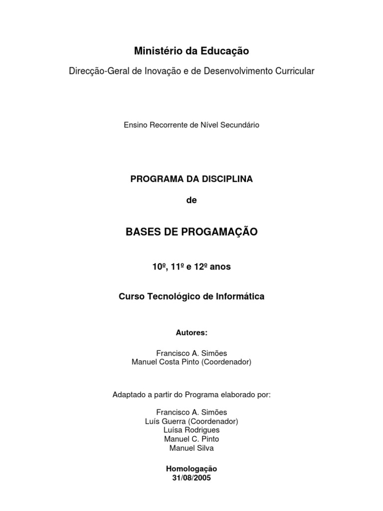 A disciplina de Bases de Programao, do Curso Tecnolgico de Informtica do Ensino Recorrente de Nvel Secundrio, uma disciplina trienal do tronco comum da componente Tecnolgica que apresenta uma carga horria semanal de duas unidades lectivas de 90 minutos, distribuda ao longo de 33 semanas em cada ano lectivo.