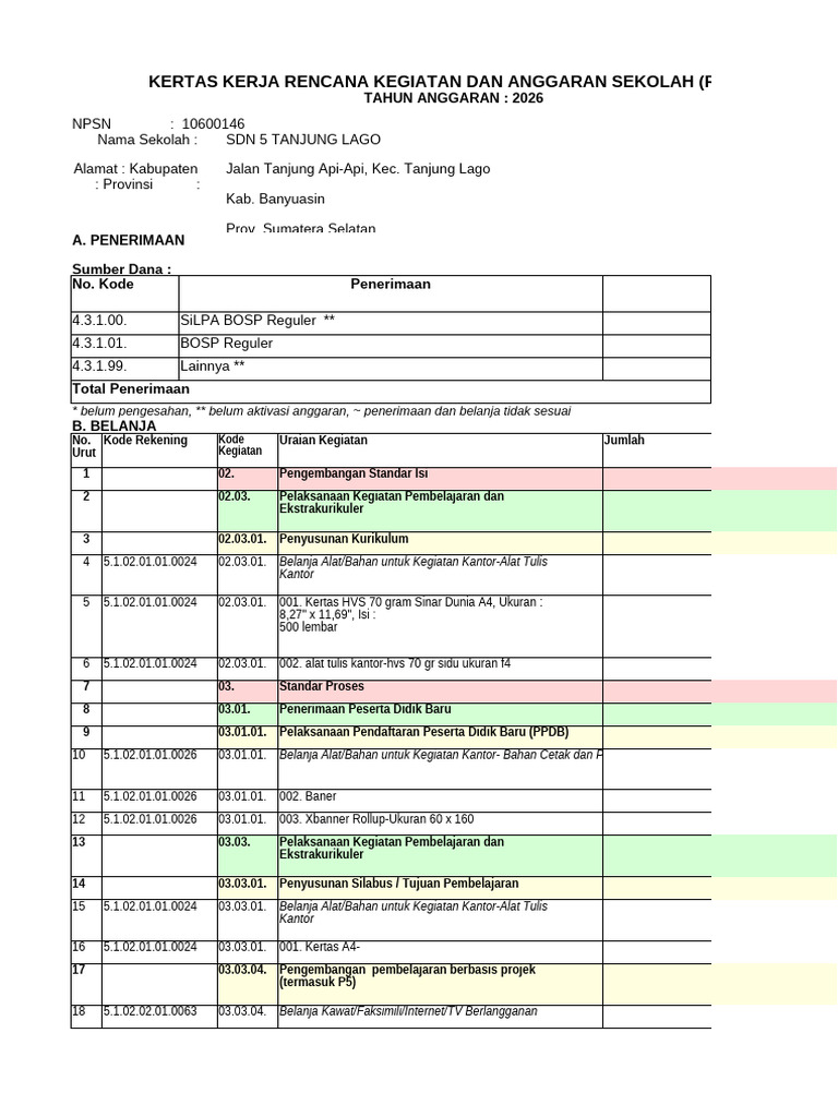 * belum pengesahan, ** belum aktivasi anggaran, ~ penerimaan dan belanja tidak sesuai
