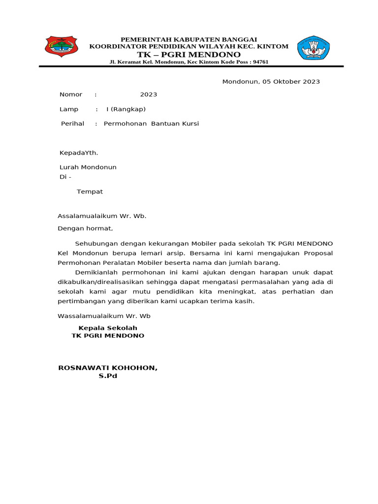 Perihal : Permohonan Bantuan Kursi