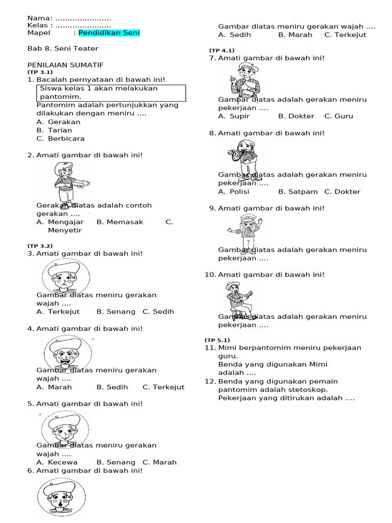 Mapel : Pendidikan Seni A. Sedih B. Marah C. Terkejut