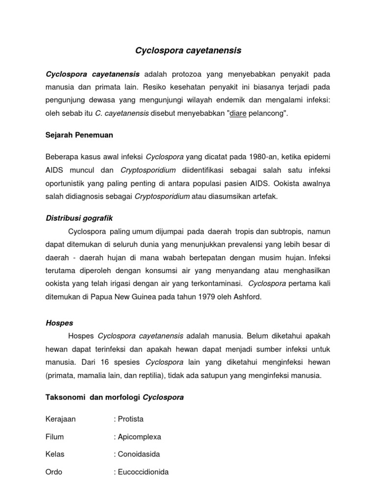 Hospes Hospes Cyclospora cayetanensis adalah manusia. Belum diketahui apakah hewan dapat terinfeksi dan apakah hewan dapat menjadi sumber infeksi untuk manusia. Dari 16 spesies Cyclospora lain yang diketahui menginfeksi hewan (primata, mamalia lain, dan reptilia), tidak ada satupun yang menginfeksi manusia. Taksonomi dan morfologi Cyclospora Kerajaan Filum Kelas Ordo : Protista : Apicomplexa : Conoidasida : Eucoccidionida
