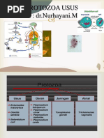 Patologi dan Gejala klinis Cyclospora cayetanensis menginfeksi saluran pencernaan melalui makanan dan air yang terkontaminasi atau dari kontak dengan kotoran. Gejala klinis yang timbul berupa diare cair (buang air lebih dari 6 kali perhari), kehilangan nafsu makan, kembung, sakit perut, muntah, mual, tidak nafsu makan, kejang abdomen, lelah dan penurunan berat badan, demam jarang terjadi. Gejala umumnya mulai sekitar 1 minggu (5-8 hari) setelah menelan ookista dan ini bisa bertahan selama sebulan atau lebih. Cyclospora masuk ke epitel usus halus dan menyebabkan enteritis. Usus kecil menjadi inflammed, dan parasit penyebab perubahan mukosa yang meliputi atropy vili dan hiperplasia crypt. Infeksi ringan dapat menghasilkan sedikit atau tidak ada tanda-tanda klinis Diare pada orang yang imunokompeten bisa berlangsung lama tetapi dapat sembuh dengan sendirinya, menurut beberapa laporan berlangsung selama 9 43 hari; ratarata lamanya organisme berkembang biak adalah 23 hari pada anak-anak.