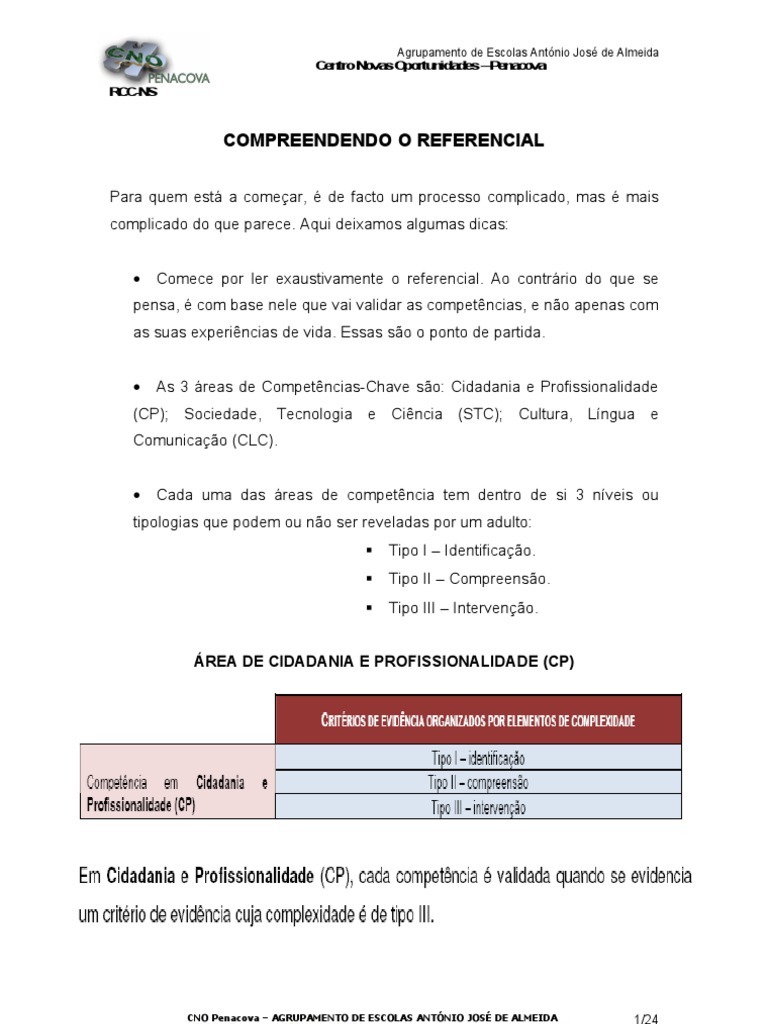 pensa, com base nele que vai validar as competncias, e no apenas com as suas experincias de vida. Essas so o ponto de partida. As 3 reas de Competncias-Chave so: Cidadania e Profissionalidade
