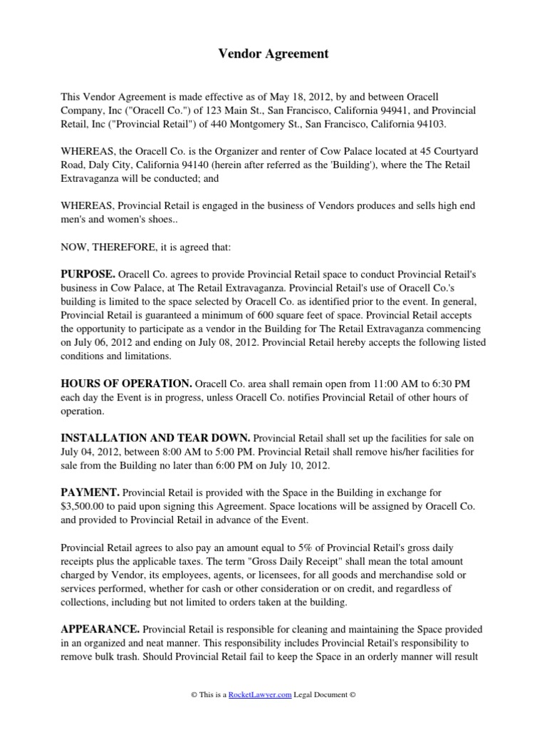 This Vendor Agreement is made effective as of May 18, 2012, by and between Oracell Company, Inc ("Oracell Co.") of 123 Main St., San Francisco, California 94941, and Provincial Retail, Inc ("Provincial Retail") of 440 Montgomery St., San Francisco, California 94103. WHEREAS, the Oracell Co. is the Organizer and renter of Cow Palace located at 45 Courtyard Road, Daly City, California 94140 (herein after referred as the 'Building'), where the The Retail Extravaganza will be conducted; and WHEREAS, Provincial Retail is engaged in the business of Vendors produces and sells high end men's and women's shoes.. NOW, THEREFORE, it is agreed that: PURPOSE. Oracell Co. agrees to provide Provincial Retail space to conduct Provincial Retail's business in Cow Palace, at The Retail Extravaganza. Provincial Retail's use of Oracell Co.'s building is limited to the space selected by Oracell Co. as identified prior to the event. In general, Provincial Retail is guaranteed a minimum of 600 square feet of space. Provincial Retail accepts the opportunity to participate as a vendor in the Building for The Retail Extravaganza commencing on July 06, 2012 and ending on July 08, 2012. Provincial Retail hereby accepts the following listed conditions and limitations. HOURS OF OPERATION. Oracell Co. area shall remain open from 11:00 AM to 6:30 PM each day the Event is in progress, unless Oracell Co. notifies Provincial Retail of other hours of operation. INSTALLATION AND TEAR DOWN. Provincial Retail shall set up the facilities for sale on July 04, 2012, between 8:00 AM to 5:00 PM. Provincial Retail shall remove his/her facilities for sale from the Building no later than 6:00 PM on July 10, 2012. PAYMENT. Provincial Retail is provided with the Space in the Building in exchange for $3,500.00 to paid upon signing this Agreement. Space locations will be assigned by Oracell Co. and provided to Provincial Retail in advance of the Event. Provincial Retail agrees to also pay an amount equal to 5% of Provincial Retail's gross daily receipts plus the applicable taxes. The term "Gross Daily Receipt" shall mean the total amount charged by Vendor, its employees, agents, or licensees, for all goods and merchandise sold or services performed, whether for cash or other consideration or on credit, and regardless of collections, including but not limited to orders taken at the building. APPEARANCE. Provincial Retail is responsible for cleaning and maintaining the Space provided in an organized and neat manner. This responsibility includes Provincial Retail's responsibility to remove bulk trash. Should Provincial Retail fail to keep the Space in an orderly manner will result